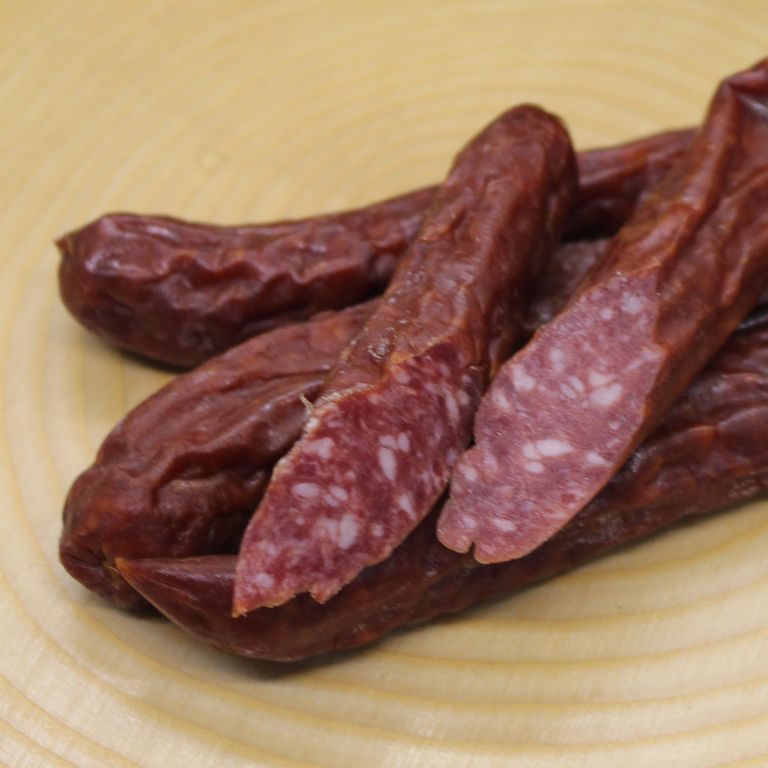 Aus bestem Reh und Wildschweinfleisch hergestellt mit einer würzigen Gewürzmischung und einer leichten Kümmelnote über Buchenholz geräuchert!